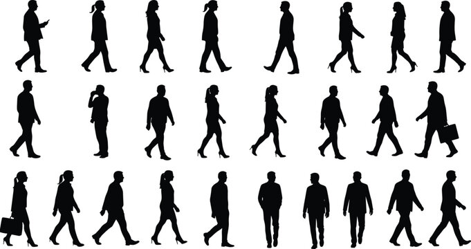 Silhouettes of walking people, diverse postures, urban motion, business attire, casual outfits, human movement, pedestrian activity, character design, animation reference,