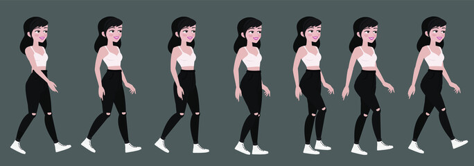 Gait beautiful student girl in trendy clothes. Teenager or fan in black jeans, animated walking.
