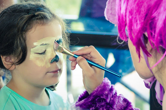 animator draws a puppy on the face of a beautiful girl on holiday at school, pink; purple and blue colors