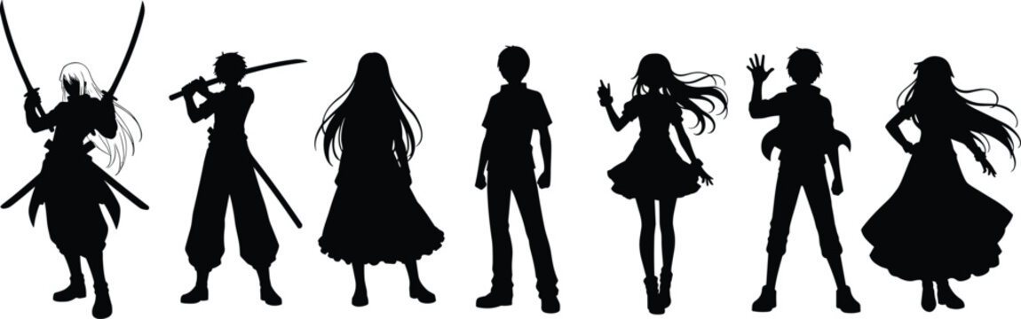 Silhouette characters, warrior poses, fantasy figures, sword fighters, anime style, dramatic stance, costume design, concept art, mysterious shadows, illustration pack