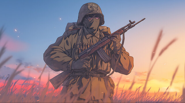 Soldier in camouflage holding a rifle, standing in a grassy field at sunset with vibrant colors