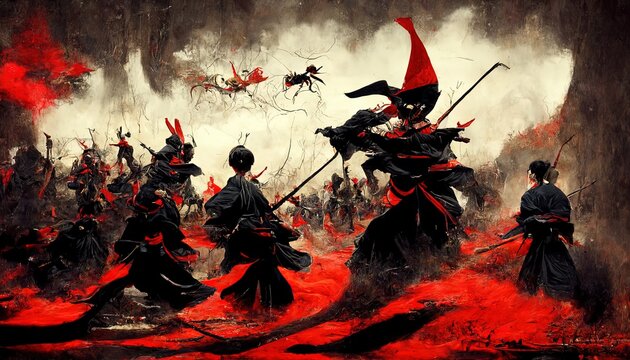 Anime style, Japanese samurai army fighting with enemy, large scene, battlefield, in Japanese black outline style and colors
