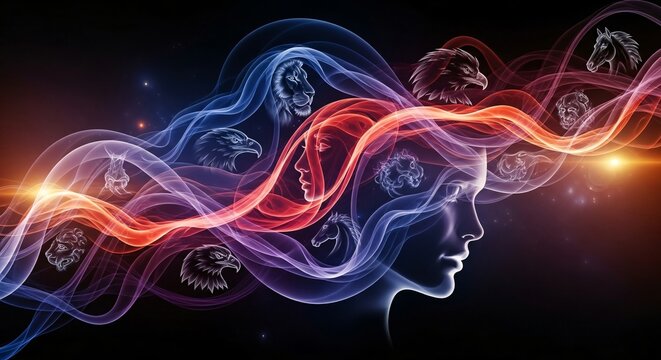 Mystical human mind unleashing inner animal spirits through vibrant smoky energy, symbolizing power and transformation