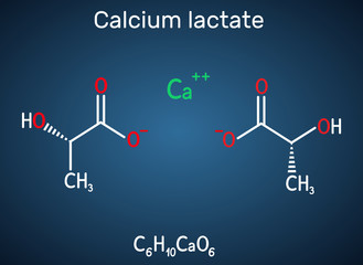 Calcium lactate, C6H10CaO6, lactate anion molecule. It is used in medicine to treat calcium deficiencies and as food additive E327. Structural chemical formula on the dark blue background