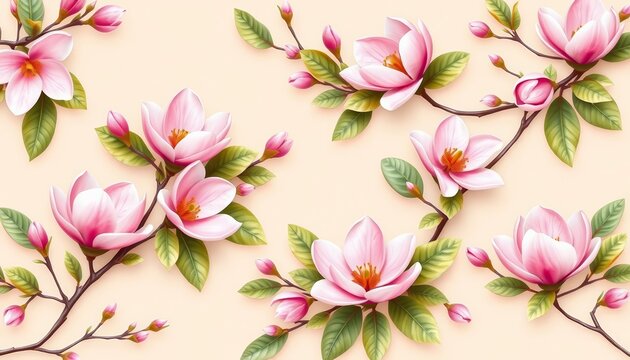 Delicate pink & white anise magnolia blossoms and leaves, seamless floral pattern on light brown pastel background, flowers, texture