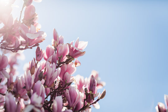 Pink and white magnolia blossoms against bright blue spring sky