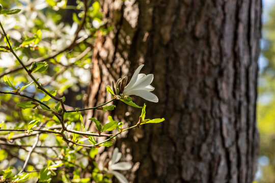 White magnolia flower blossoming at pine tree background. Creamy blossom of white magnolia branch at brown tree trunk. White magnolia flower blooming at botanic garden.