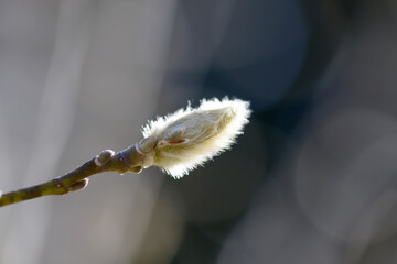 Furry buds of Magnolia salicifolia, aka willow-leafed or anise magnolia. With lichen.