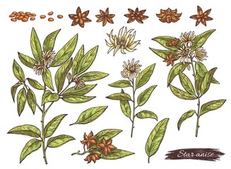 Anise plant parts set with anise stars, engraving vector illustration isolated.