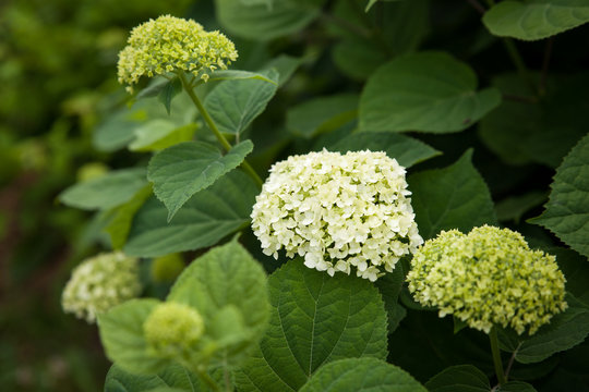 A combination in the garden design of a bouquet of hydrangea Incredible ball and Pink annabel. High quality photo