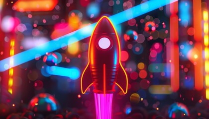 A company anniversary event is marked by a spectacular display of a neonlit rocket, symbolizing decades of accelerated business growth