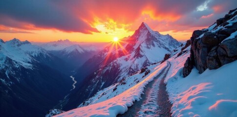 Dramatic sunrise over snow-covered peaks, rugged trekking path, high altitude, vista