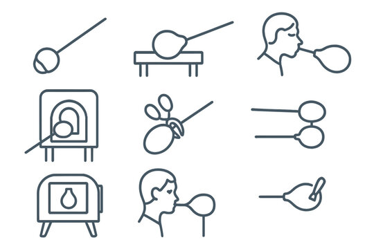 Glassblowing Icon Steps. Line style icons of glassblowing process steps: gathering molten glass, shaping on marver, blowing air,