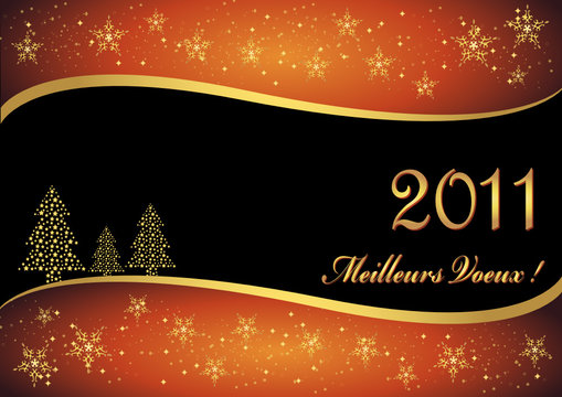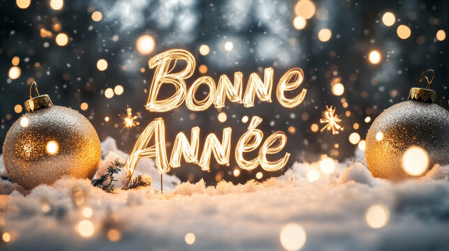 Happy new year background written in French language Bonne Année in yellow gold letters and festive backdrop with snow and bokeh light
