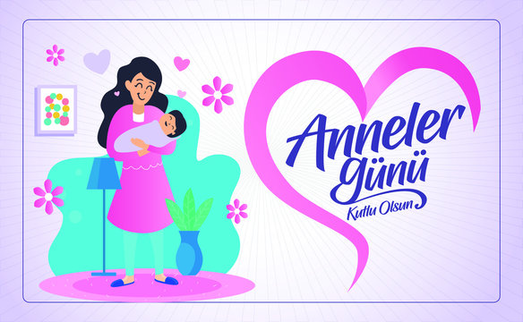 Anneler Gunu, beautiful women, translation: Happy mother's day. Wishes mom greeting card for mothers day. Vector Illustration