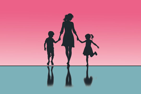 Silhouette of a mother and two children on a pink background. It symbolizes the strong bond of motherhood and is ideal for celebrating Mother's Day.