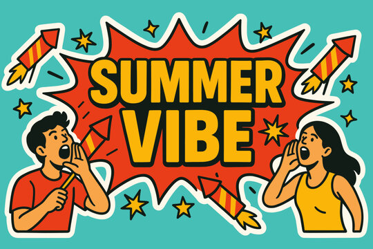 anner flat vector illustration bold oversized text inside outline cartoon characters shouting with rockets bright solid colors high contrast explosion shapes and stars minimal background.