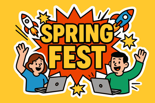 anner flat vector illustration bold oversized text inside outline cartoon characters waving with laptops and rockets bright solid colors high contrast explosion shapes and motion lines.