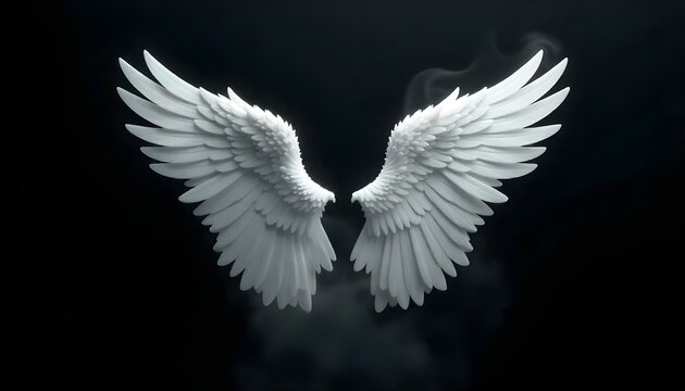 Dos alas de ángel blancas sobre fondo negro, arte digital, iluminación suave y difusa, esquema monocromático, texturas suaves
