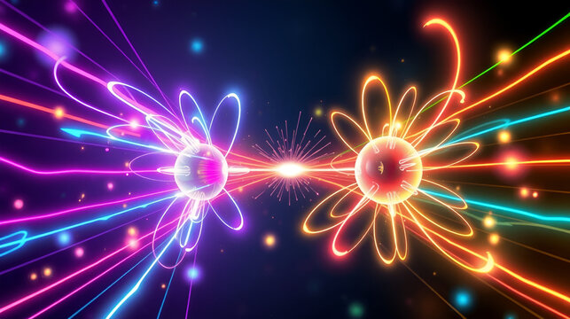 The illustration shows vibrant colored lines representing positrons and electrons colliding, creating a burst of light as they annihilate each other and release energy in the form of photons