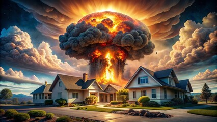 Vibrant digital art depiction of a massive nuclear mushroom cloud explosion erupting from a suburban house, surrounded by a swirling vortex of fiery debris and energy.