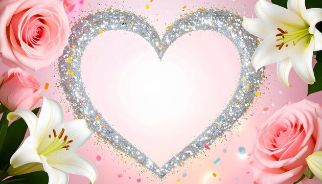 A glittery heart frame is set against a soft pink background. It is surrounded by beautiful pink roses and elegant white lilies, creating a perfect template for wedding or anniversary cards.