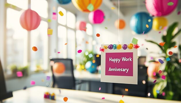 Colorful paper lanterns and confetti floating over an office desk, where a "Happy Work Anniversary" card is prominently displayed