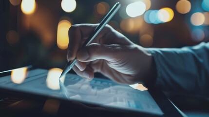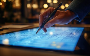 A lawyer uses a digital pen to annotate a contract on a large interactive screen, showcasing the use of technology in modern legal practice, a sleek and modern office as the backdrop.