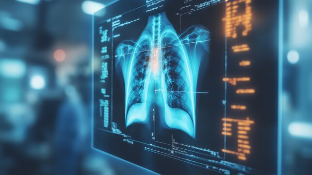 A chest X ray featuring advanced AI generated annotations for analyzing lung conditions