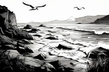 the ai generated image, coastal cove with golden sands, azure waters, and rugged cliffs,