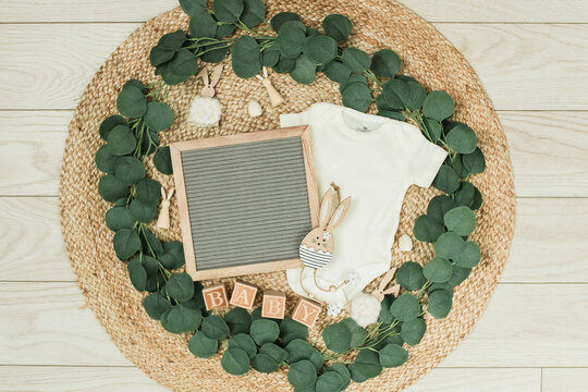 White baby onesie laid on fabric with coffee beans and latte nearby with copy space, coffee themed pregnancy announcement concept