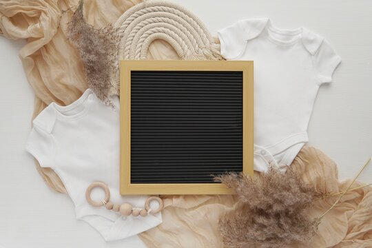 White cotton baby bodysuit with black letter board and beige cotton fabric background with copy space, pregnancy announcement mockup template