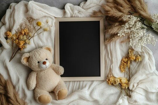 Pregnancy announcement with teddy bear dried flowers and a black letterboard in the centerof a soft muslin blanket