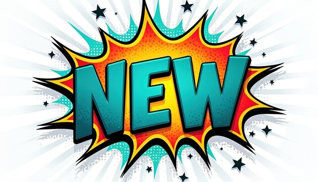 Dynamic comic book style burst graphic announces arrival of fresh items. Vibrant text promotes product launch and special sales event. Exciting graphic design for marketing.
