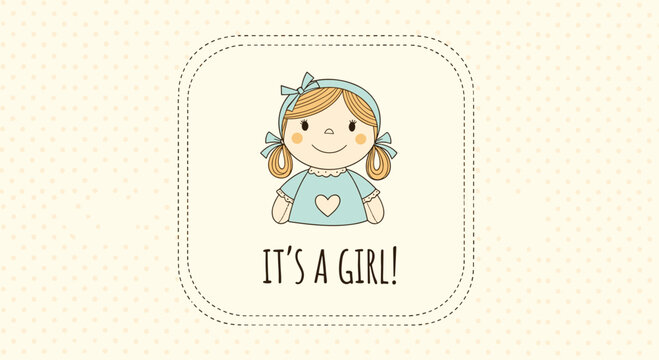 Cute cartoon rag doll with pigtails and a heart on her dress announces 'It's a girl!' on a soft polka dot background.