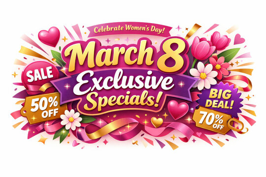 March 8 Sale Extravaganza. Modern holiday banner with short greeting slogan, vibrant March 8 sale banner announcing special offers