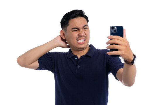 Frustrated man scratching neck while looking at smartphone with confused and annoyed expression isolated on transparent background
