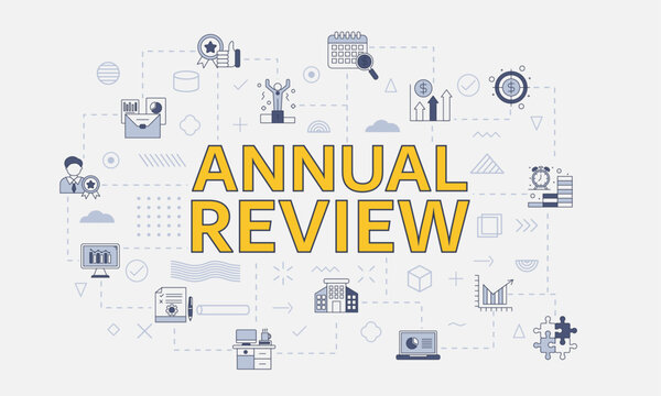 Annual review, business and customer review. Review evaluation time for review inspection assessment auditing. Learning, improvement, planning and development. End of year business concept.