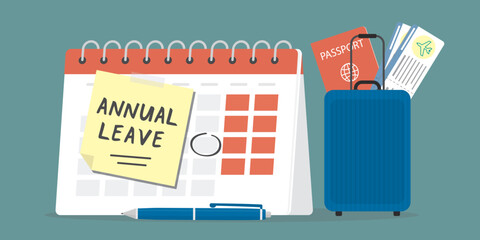 Annual leave, schedule reminder of annual leave concept, vacation to rest and relax from hard work, happy businessman running with luggage from calendar with annual leave note.