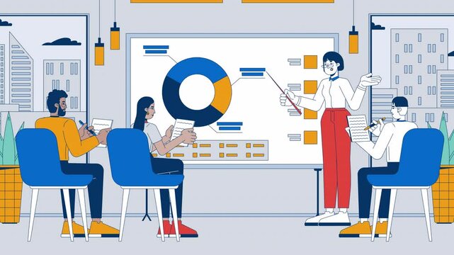 Company summary of fiscal year cartoon animation. Annual report performance 4K video 2D motion graphic. Woman manager briefing team diverse animated characters on whiteboard statistics background