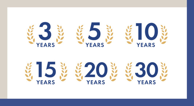月桂冠付き記念ロゴセット・年数別アニバーサリーデザイン|3年,5年,10年,15年,20年,30年