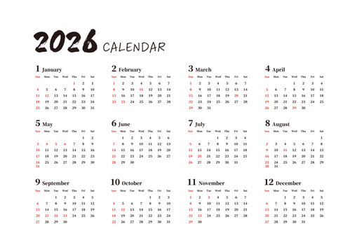 2026年のシンプルな日本の年間カレンダー 日曜始まり