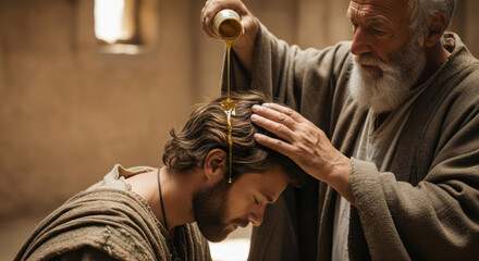 A prophet anoints a young man's head with oil from a bottle, symbolic of the anointing of King David in the Old Testament, representing ancient biblical traditions and spiritual blessing.