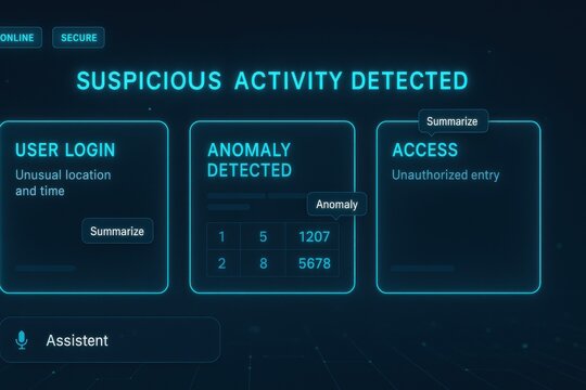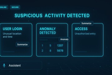 Suspicious activity alert on digital dashboard with anomaly detection and user login warning interface