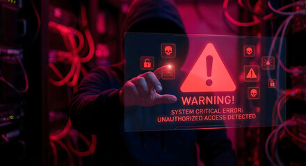 Cyber attack warning with unauthorized access detected message and hooded hacker in server room