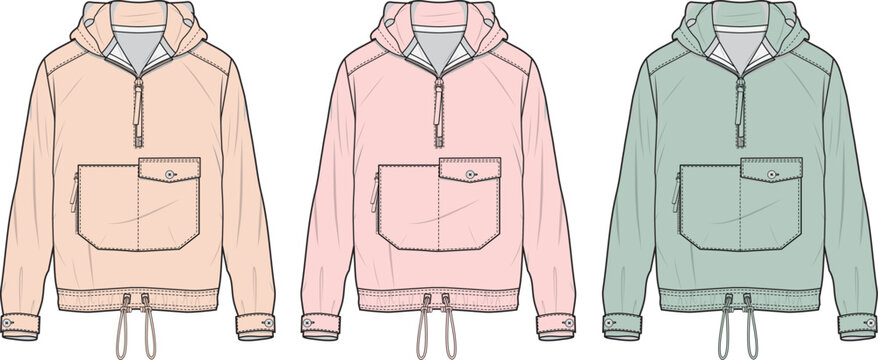 Women's quarter-zip pullover hoodie anorak jacket with front pocket, a technical flat fashion sketch template vector set in pastel colors