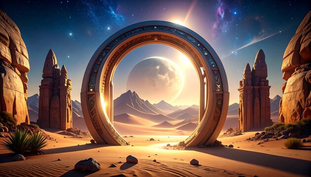 Lush alien world portal architecture with jungle landscape and celestial gateway to another dimension. Celestial Forest Portal. Illustration