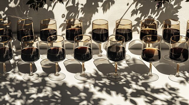 A collection of wine glasses arranged beside one another on a wall, casting a tree's shadow