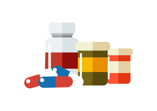 Vector drugs icon, pills, capsules ans prescription bottles. Medicine vector illustration, modern flat cartoon style.