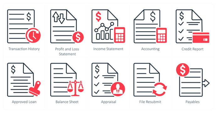 A set of 10 banking icons as transaction history, profit ans loss statement, income statement